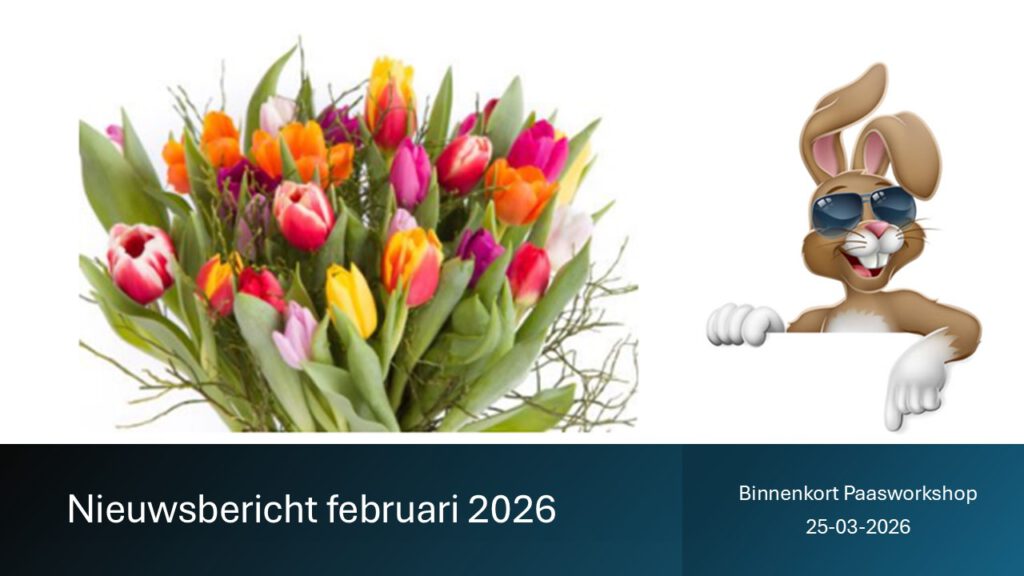 De eerstkomende workshop is weer de Paasworkshop op woensdagavond 25 maart 2026. Zet die maar alvast in je agenda. Deze staat binnenkort op de website zodat je je in kan schrijven. Een BBQ- en Hanging Basket-workshop volgen ook nog in de eerste helft van dit jaar, ook hierover zal binnenkort meer informatie op de website staan!